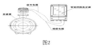 化工污水管道流量計是由流量傳感器和轉換器(也叫顯示器)兩大部分組成。測量管上下裝有激磁線圈,通激磁電流后產生磁場穿過測量管,一對電極裝在測量管內壁與液體相接觸,引出感應電勢,送到轉換器。激磁電流則由轉換器提供。如圖2所示: