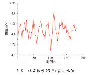在頻域中對紙漿信號觀察時發現,紙漿信號的漿液噪聲頻帶在零頻率點附近,距離流量信號基波頻率點較遠,對基波幅值和各奇次諧波幅值基本沒有影響,紙漿信號在頻域中的圖形如圖7所示。選擇一組采集的紙漿信號,把其等分成數段,利用MATLAB計算每段數據在基波處的幅值并提取保存在一個數組中,使用繪圖工具畫出來,如圖8所示??梢姡ǚ翟?.7~4.95mV變化,波動較小。因此,提取到的與流量相關的感應電動勢信號幅值會比較穩定。