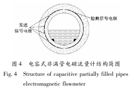 ②電容式非滿管軟化水流量計h。電容式非滿管軟化水流量計結構簡圖如圖4所示。、檢測信號電極 發送信號電