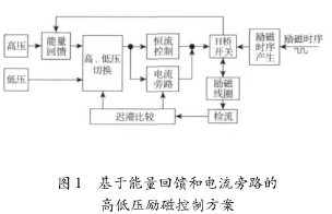 基于能量回饋和電流旁路的高低壓勵磁控制方案框圖如圖1所示,主要由高、低壓電源、能量回饋電路、高、低壓切換電路、恒流控制電路、電流旁路電路、H橋開關電路、檢流電路和勵磁時序產生電路組成。