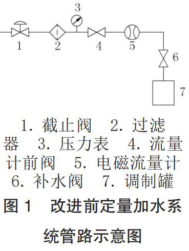 工廠的香料廚房系統為國內煙機公司 2004 年設計制造,其定量加水系統主要由水源、管道電磁流量計、加水管路元件和控制程序這四部分組成,改進前管路示意圖如圖 1 所示。
