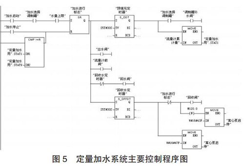 定量加水系統的工作過程為:當設定好加水量后,啟動系統,多級離心泵 10、回流閥 4、出水閥 9 和流量計前閥 12開啟對管路進行預填充;延時 30s 預填充完成后,回流閥 4關閉,調制罐補水閥 14 開啟,同時質量流量計 13 開始計量;當質量流量計的累積量與設定加水量一致時,出水閥 9 和調制罐補水閥 14 關閉;調制罐定量加水完成后,開啟回收閥17 和回流閥 4 以及同未關閉流量計前閥 12 一起,利用壓縮空氣對管道中水實現回收;延時 30s 水回收完成后,關閉多級離心泵、球閥 4、12 和 17,定量加水過程完成。定量加水系統主要控制程序如圖 5 所示。