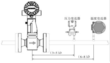 智能渦街流量計的口徑如果與工藝管道相同,不能滿足流量儀表要求時,或者在此流速下測量準確度不能保證時,需要縮小儀表口徑,從而提高管內流速,保證測量精度。上下游必須有足夠的直管段,若傳感器安裝點的上游在同一平面上有 2 個 90°彎頭時,上游直管段≥25D,下游直管段≥5D。根據測量的需要,需在智能渦街流量計附近測量壓力和溫度時,測壓點應在傳感器下游的(3 ~5)D 處,測溫點應在傳感器下游的(6 ~8)D 處,如圖 3 所示。