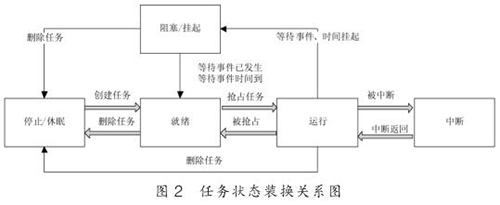 μC/OS-III 中的每一個任務都是無限循環的 。 每個任務會有五種狀態,并且處于五種狀態之一。 這五種狀態分別是:睡眠態、就緒態、運行態、等待態以及中斷服務態。 睡眠態是指任務只是以代碼的形式存在于程序空間, 并未交給操作系統進行管理; 就緒態是指系統為任務配備了任務控制塊且在任務就緒表中進行了就緒登記,使任務具備了運行的充分條件;運行態是指處于就緒態的任務如果經調度器判斷獲得了 CPU 的使用權時的狀態;等待態則是正在運行的任務,需要等待一段時間或需要等待一個事件發生再運行; 中斷服務狀態是指一個正在運行的任務一旦響應中斷申請就會中止運行而去執行中斷服務程序。這五種狀態在系統管理下的轉換關系由圖 2 所示。