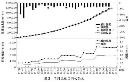 圖 2 的結(jié)果顯示,容積法校驗(yàn)電磁流量計(jì)累計(jì)偏差開始階段不穩(wěn)定,后期趨于穩(wěn)定,在 -3. 0%附近。這是測(cè)量中不可避免存在某幾個(gè)時(shí)刻(特別出廠水流量改變時(shí))某些測(cè)量點(diǎn)液位波動(dòng)較大,導(dǎo)致記錄數(shù)值與真實(shí)情況存有較大差異,一開始累計(jì)出水總量較少,偏差會(huì)相對(duì)放大,在后期累計(jì)水量大,這一原因?qū)е碌钠顪p少,偏差值也趨于穩(wěn)定。