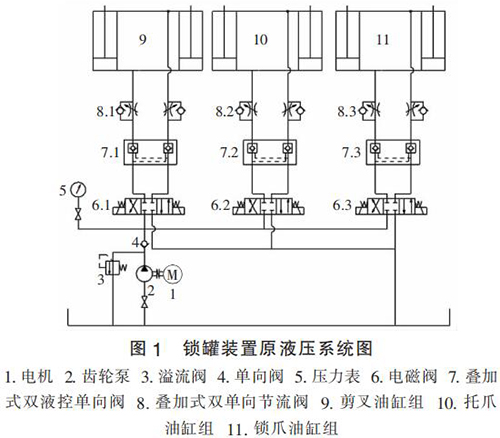 氪氣流量計原液壓系統圖如圖 1 所示。 通過分析圖 1 發(fā)現,原液壓系統中剪叉油缸組、托爪油缸組及鎖爪油缸組并聯安裝,并均由齒輪泵供油,該系統設計簡單,液壓元件選擇不夠合理,工作效率低,電機發(fā)熱大,主要存在的問題:
