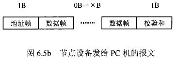 在插入式電磁流量計等節(jié)點設備和C機通信的過程中,由地址幀、命令幀、數(shù)據(jù)幀、校驗和可組成各種功能不同的報文。由于采用主從工作方式來實現(xiàn)通信,插入式電磁流量計等節(jié)點設備僅能接收并執(zhí)行PC機發(fā)送來的控制命令,而不能發(fā)送命令給PC機。因此,由PC機發(fā)往流量計等節(jié)點設備的報文一般包括一個地址幀,一個命令幀,若干個數(shù)據(jù)幀和一個校驗和,其報文格式圖.6a5所示;而由流量計等節(jié)點設備發(fā)往PC機的報文一般包括一個地址幀,若干個數(shù)據(jù)幀和一個校驗和,其報文格式如圖6.5b所示。