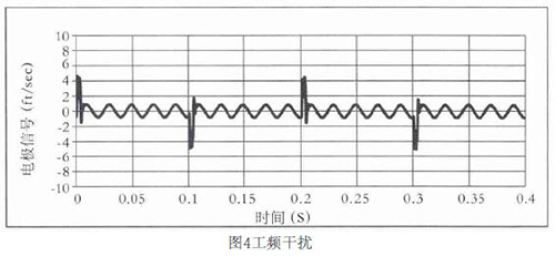 工頻干擾是電磁管道流量計常見的干擾源。當流量計處于電源形成電磁場中時,由于分布電容的存在,以電磁波的輻射形式干擾電極信號,或者是由供電電源引入的工頻串擾,工作現場的工頻共模干擾,其產生的物理機理均是電磁感應原理。幅度與流量信號相比,往往要大幾個數量級,頻率與供電電源頻率相同。如圖4所示,線圈驅動頻率為5Hz的電極信號,被耦合了50Hz的工頻干擾,幅度大概相當于1feet/s。