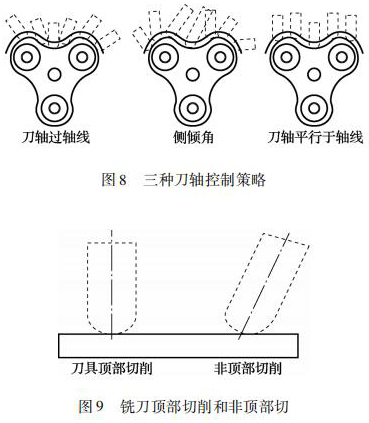 四軸加工中采用球頭銑刀,刀軸控制策略是提高加工效率和轉(zhuǎn)子曲面表面粗糙度的關(guān)鍵。如圖 8所示,刀軸控制策略有常見的刀軸過軸線、側(cè)傾角、刀軸平行于軸線。筆者采用平行軸線銑削加工方式對這 3 種刀軸控制策略進(jìn)行實際加工對比,得出采用側(cè)傾角刀軸控制策略加工出的轉(zhuǎn)子曲面表面粗糙度*好。其原因主要由于刀軸平行于軸線這種刀軸控制策略采用球頭銑刀加工時,其刀具切削轉(zhuǎn)子曲面時的接觸點為刀具的頂部,球頭銑刀的頂部直徑為零,線速度也為零。此時刀具是在擠壓工件,刀具頂部也容易磨損。刀軸過軸線策略雖然刀具與轉(zhuǎn)子曲面的接觸點一直在變換,但是也有刀位點是采用刀具頂部去切削。側(cè)前傾角刀軸控制策略: 控制刀具與轉(zhuǎn)子曲面接觸點的位置,避免球頭銑刀頂部銑削轉(zhuǎn)子曲面,實現(xiàn)刀尖的點的偏離,提高刀具切削點的線速度。球頭銑刀頂部切削和非頂部切削如圖 9 所示。
