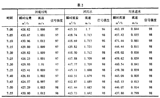 下面是隨機地從計算機中抽取的某一日的幾組數據(表2)。從表中可以看出采用超聲波流量計側量數據精確度較高,讀取數據方便,從信號強度上可以看出,在測量回流污泥時,信號強度較低,這是由于液體濁度較高,含有較大固體顆粒引起信號衰減造成的。